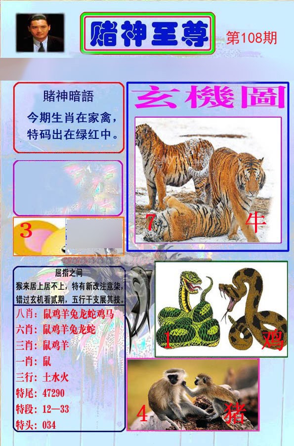 108期:规律四肖 【猪虎猴马】开:?00 |